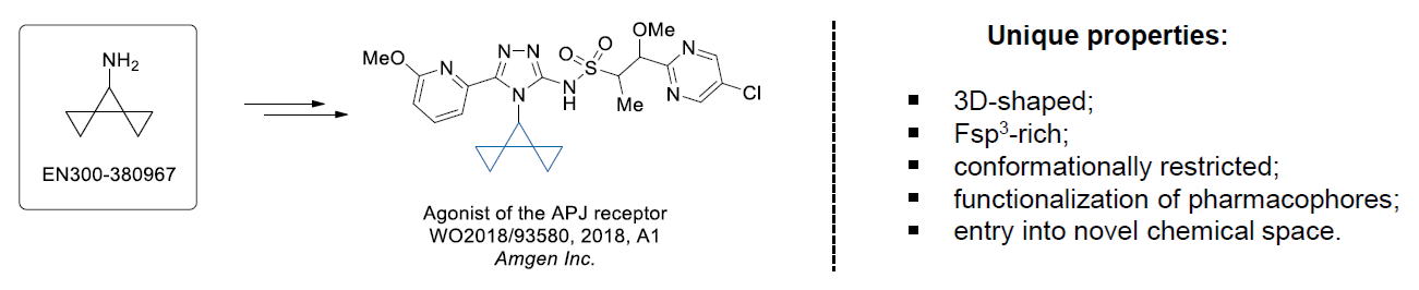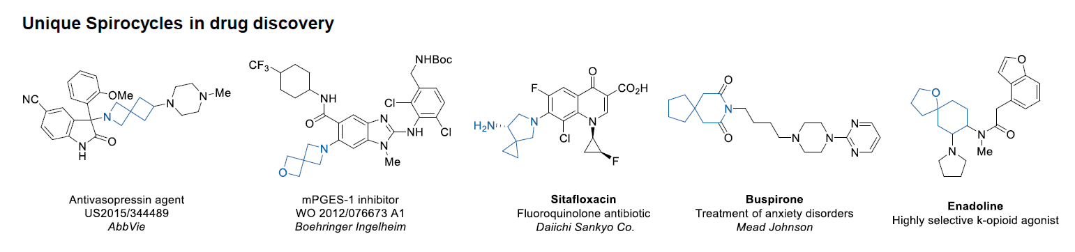 Conformational rigidification of flexible compounds by introducing a ring is a popular strategy in drug design. The resulting cyclic analogues usually have a reduced conformational entropy penalty upon binding to a protein target. A conformational restriction can also be imposed by introduction of a spirocyclic ring. Spirocyclic systems are 3D-shaped, in strict contrast to flatten benzene compounds. It is especially true for polycyclic compounds. In this context, Enamine offers a library of innovative three-cyclic scaffolds for drug design.