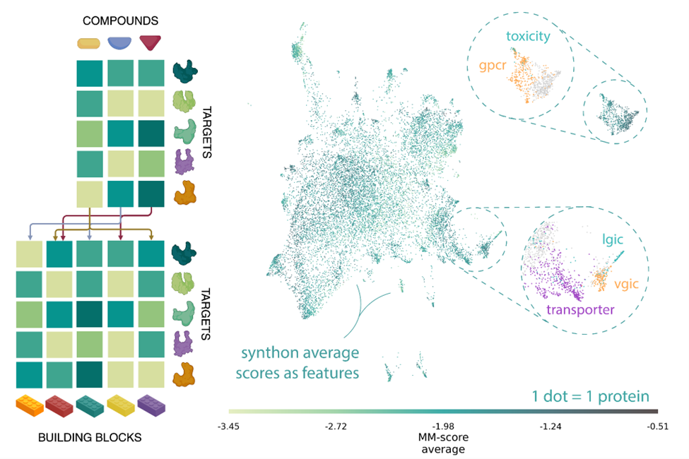 Left) MatchMaker ligand-target interaction likelihood scores were mapped onto a reduced-dimensionality space defined by synthons, theoretical building blocks of chemistry. Right) 2D projection of the human proteome as a function of their MatchMaker DTI prediction profile in synthon space. The feature space carries inherent biological and functional information as similar protein families are clustered together.