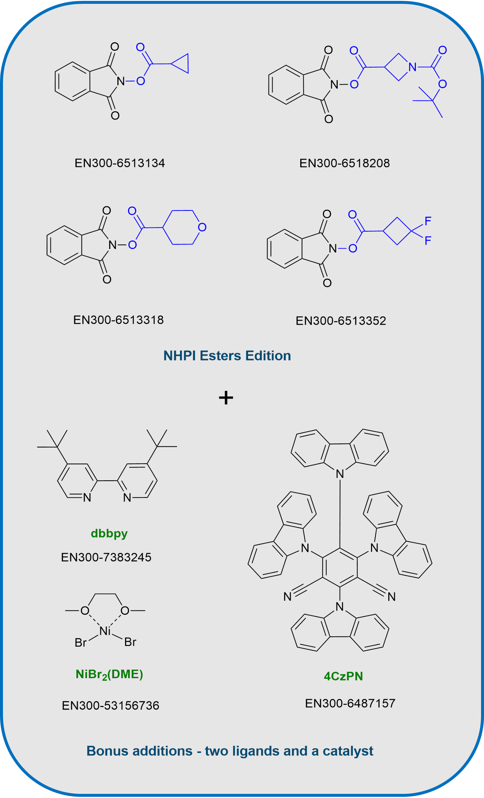 - Includes activated NHPI esters — ideal substrates for mild decarboxylative C(sp³)-radical generation.