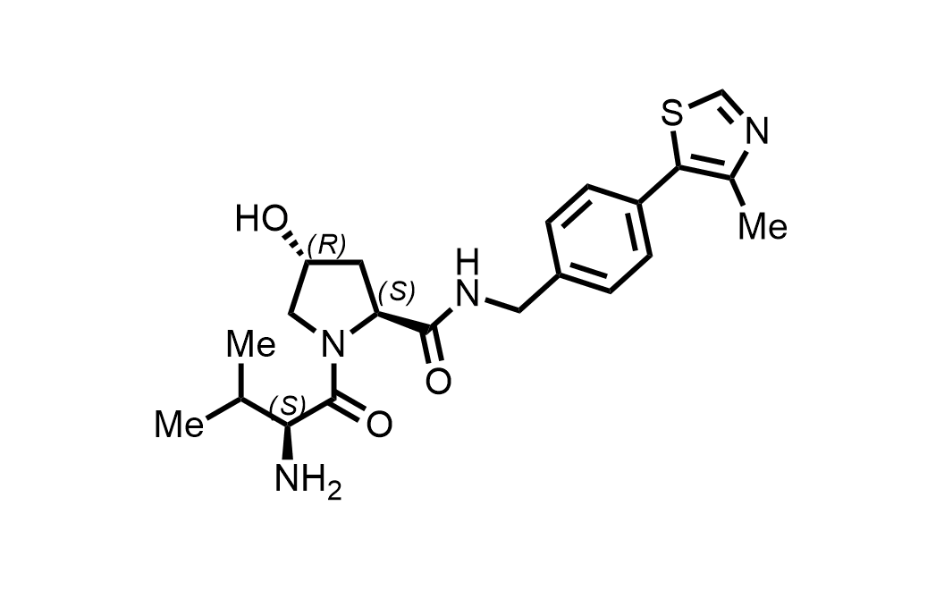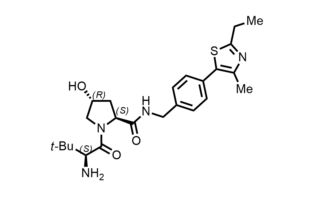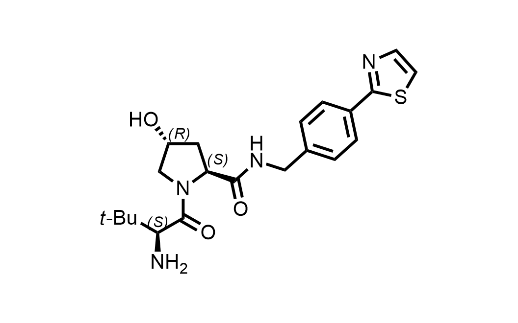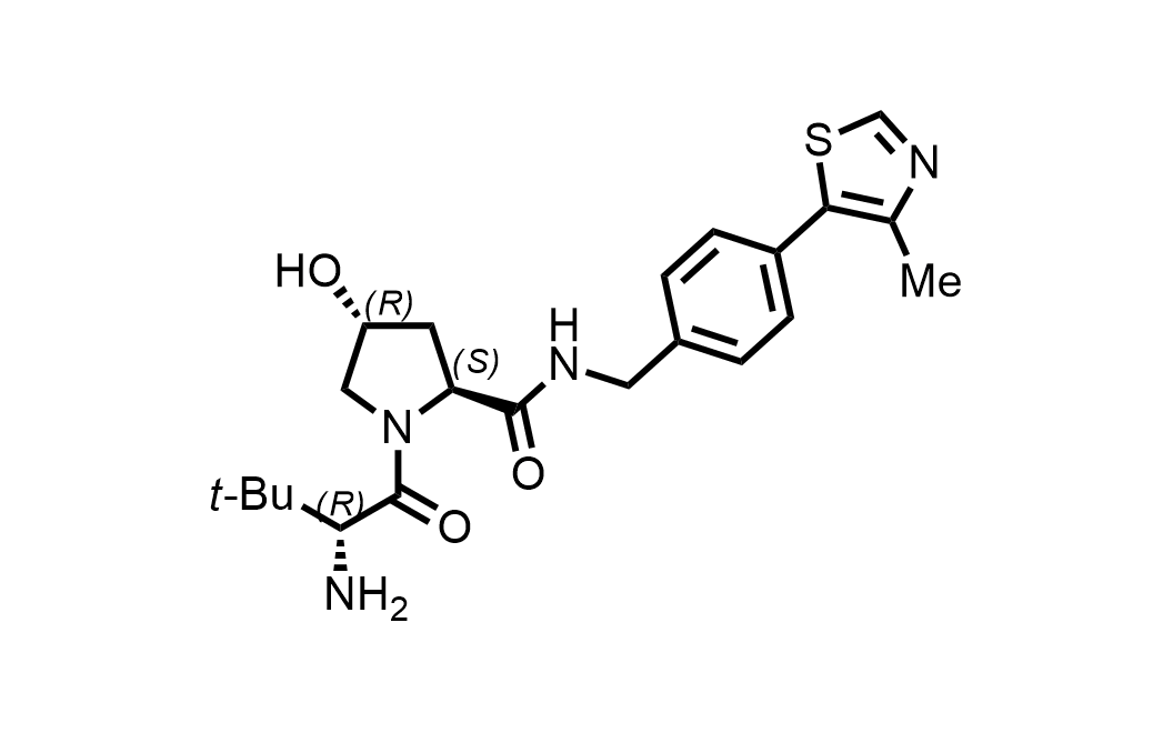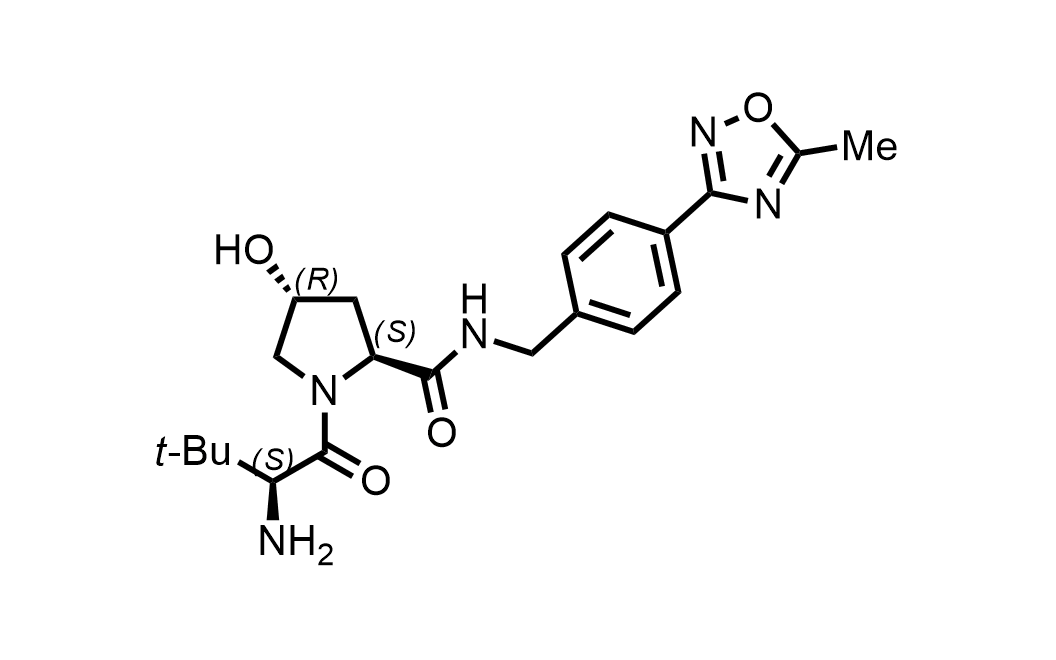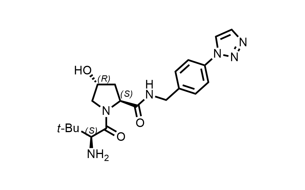 Proteolysis targeting chimeras (PROTACs) are therapeutic agents designed to induce selective intracellular degradation of pathogenic proteins. They consist of two covalently linked ligands: one binds to the target protein, while the other recruits an E3 ubiquitin ligase to tag the unwanted protein for degradation. Ciulli and coworkers developed several efficient small-molecule ligands that recruit the von Hippel-Lindau (VHL) E3 ubiquitin ligase for the degradation tagging, among them VH032, VH101, and VH298 with nanomolar binding affinity. Few PROTACs utilizing the VHL ligase – DT2216, PRT3789, ASP3082, and KT333 – have advanced to clinical trials. At Enamine, we provide building blocks related to VH101, including diverse attachment sites and structural modifications. Additionally, we offer support for the synthesis of custom PROTAC molecules that feature a range of linkers and protein binders.