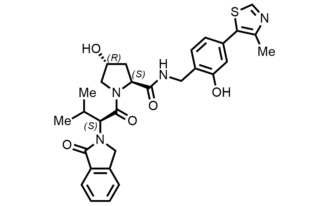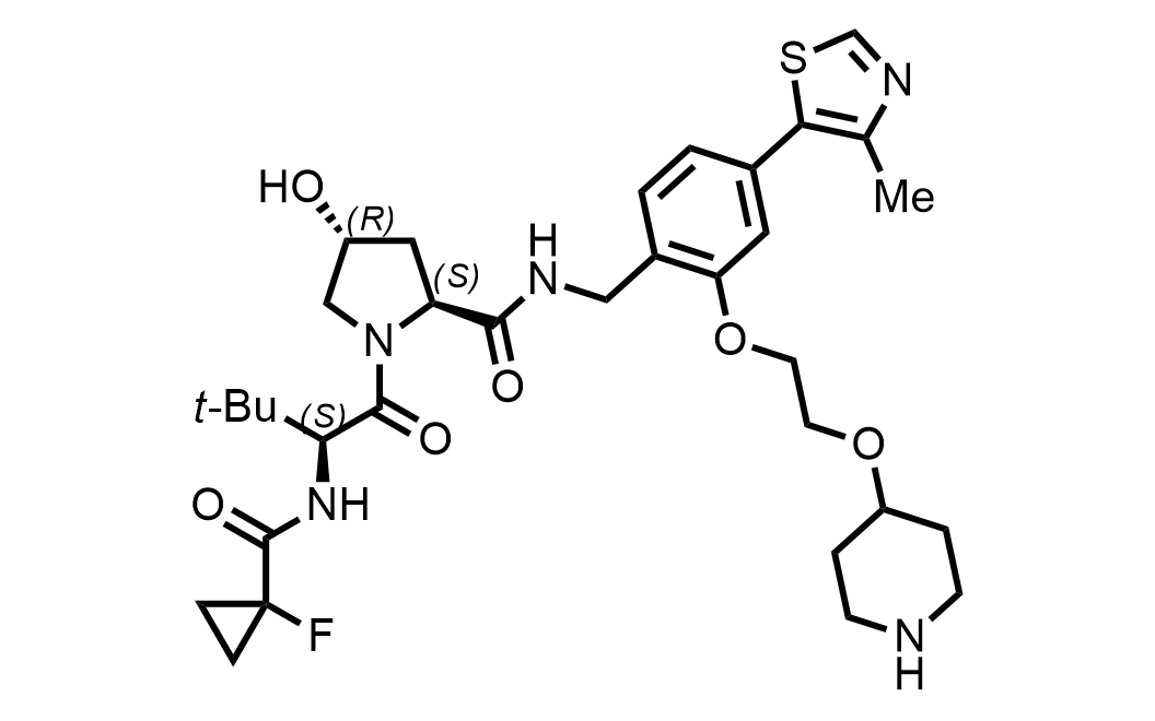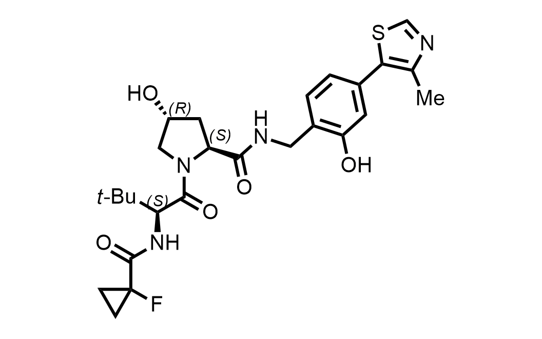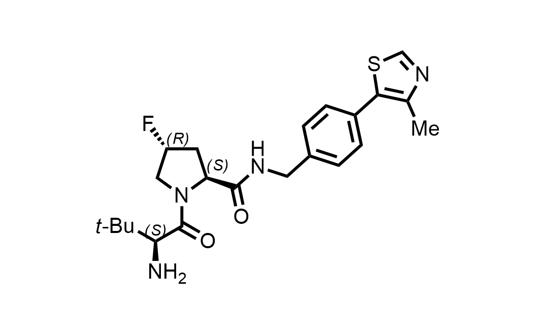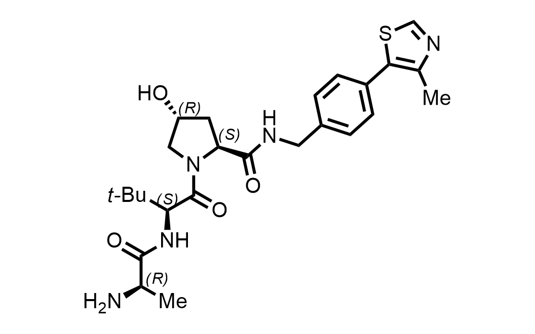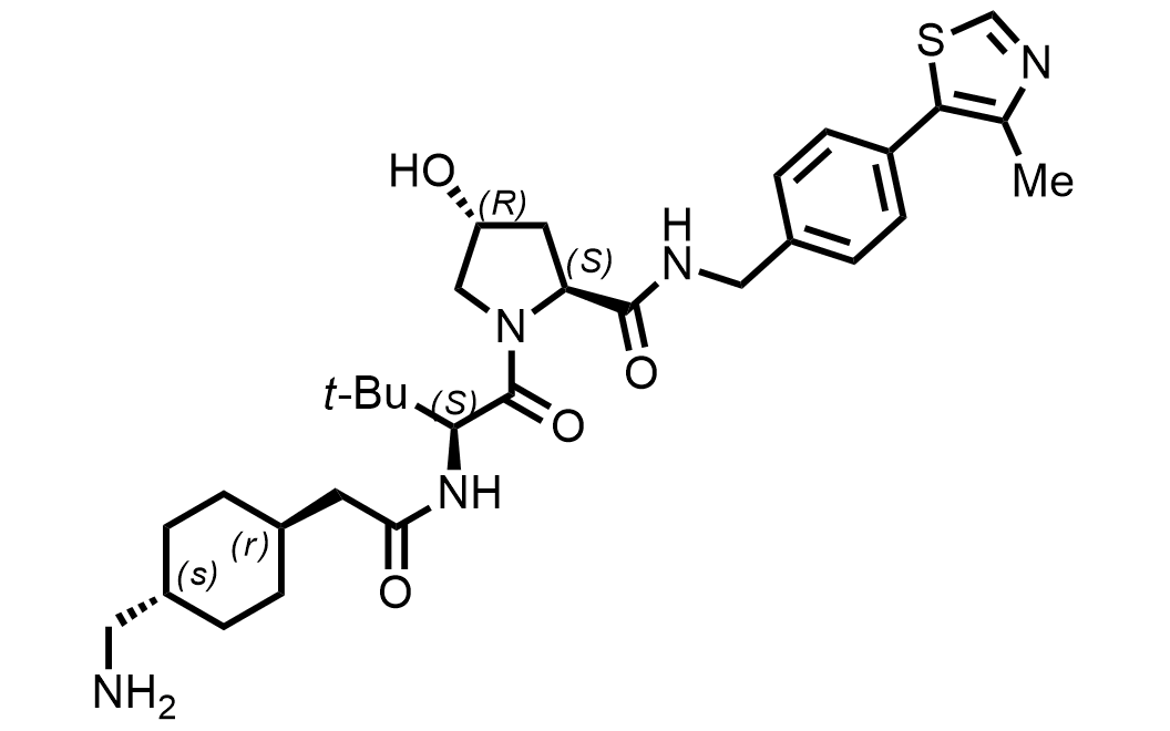 Proteolysis targeting chimeras (PROTACs) are therapeutic agents designed to induce selective intracellular degradation of pathogenic proteins. They consist of two covalently linked ligands: one binds to the target protein, while the other recruits an E3 ubiquitin ligase to tag the unwanted protein for degradation. Ciulli and coworkers developed several efficient small-molecule ligands that recruit the von Hippel-Lindau (VHL) E3 ubiquitin ligase for the degradation tagging, among them VH032, VH101, and VH298 with nanomolar binding affinity. Few PROTACs utilizing the VHL ligase – DT2216, PRT3789, ASP3082, and KT333 – have advanced to clinical trials. At Enamine, we provide building blocks related to VH101, including diverse attachment sites and structural modifications. Additionally, we offer support for the synthesis of custom PROTAC molecules that feature a range of linkers and protein binders.