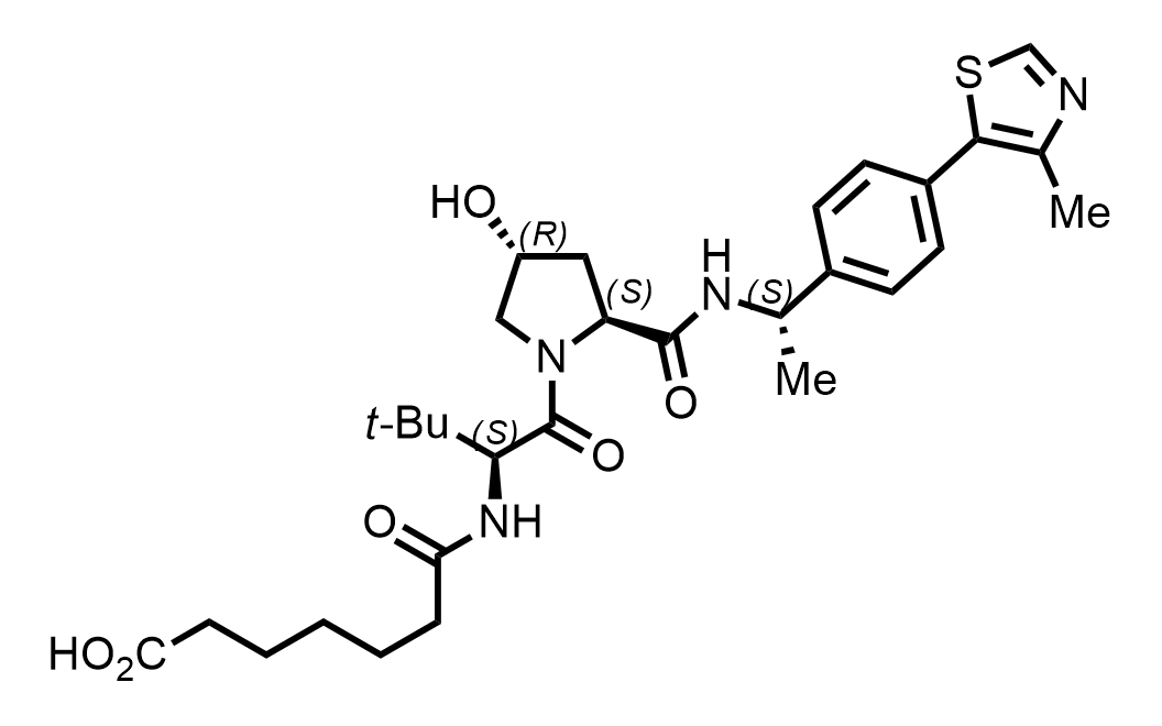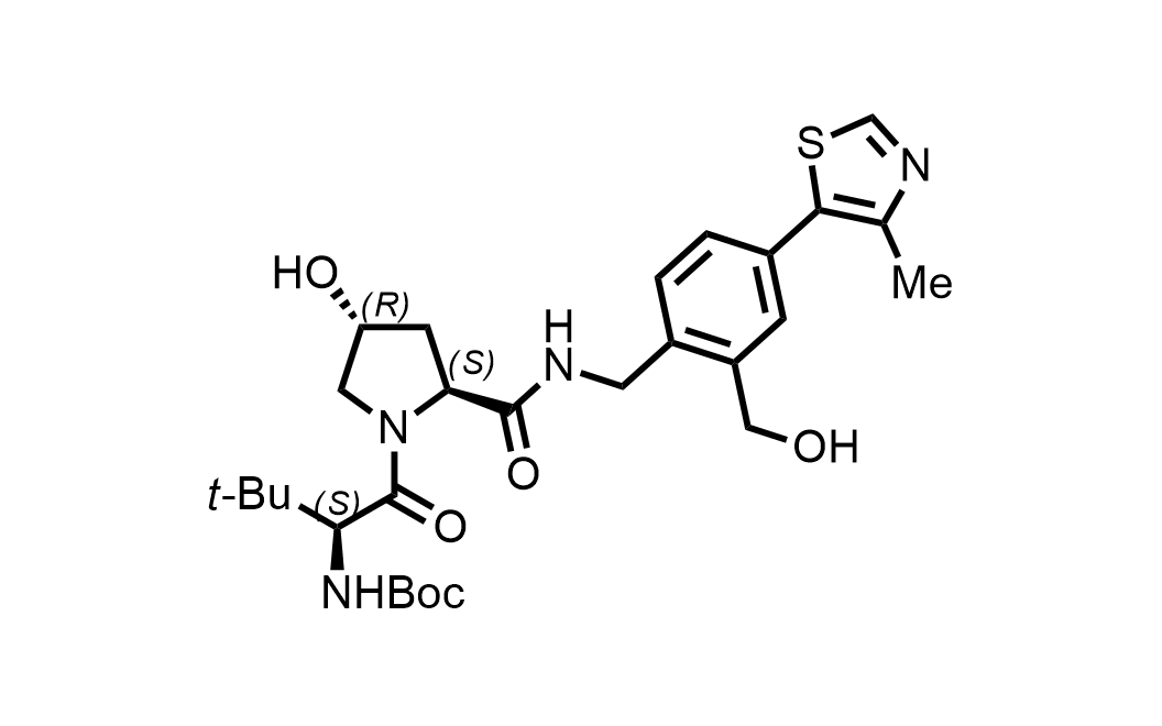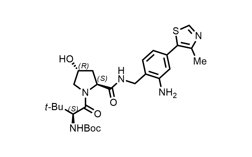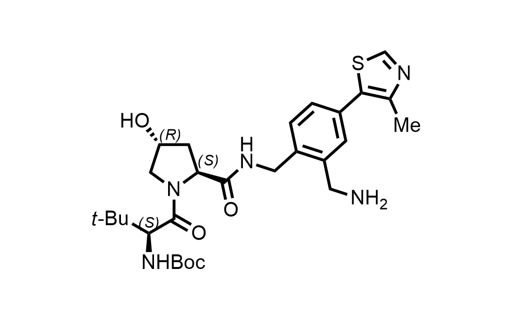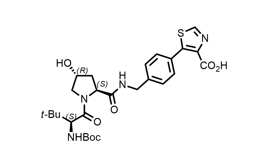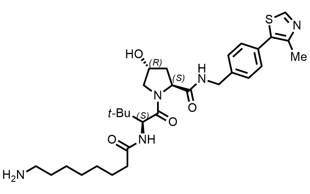 Proteolysis targeting chimeras (PROTACs) are therapeutic agents designed to induce selective intracellular degradation of pathogenic proteins. They consist of two covalently linked ligands: one binds to the target protein, while the other recruits an E3 ubiquitin ligase to tag the unwanted protein for degradation. Ciulli and coworkers developed several efficient small-molecule ligands that recruit the von Hippel-Lindau (VHL) E3 ubiquitin ligase for the degradation tagging, among them VH032, VH101, and VH298 with nanomolar binding affinity. Few PROTACs utilizing the VHL ligase – DT2216, PRT3789, ASP3082, and KT333 – have advanced to clinical trials. At Enamine, we provide building blocks related to VH101, including diverse attachment sites and structural modifications. Additionally, we offer support for the synthesis of custom PROTAC molecules that feature a range of linkers and protein binders.