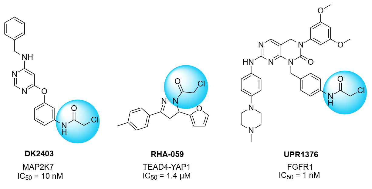 Several compounds with сhloroacetamide warheads are under active investigation and demonstrate encouraging therapeutic potential: RHA-059, UPR1376, and DK2403 (highly potent and selective covalent MAP2K7 inhibitor, targeting Cys218 in the kinase active site).