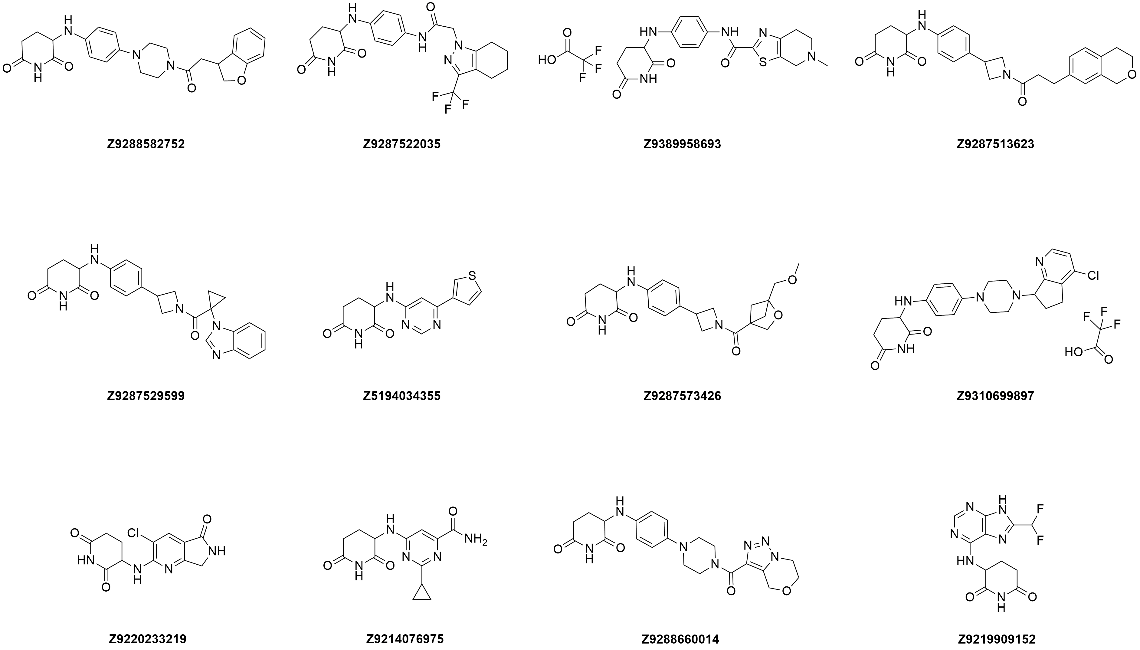 Our library is 80% designed around published and validated Phenyl Amino Glutarimide (PAG) CRBN E3 binders with high variability in exit vectors. The remaining 20% of the library is built around various heteroaromatic amino glutarimides.