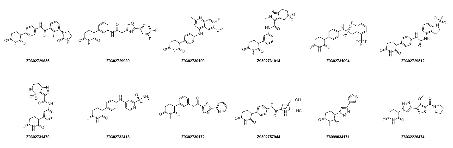 Phenyl glutarimide (PG) derivatives represent a promising alternative chemotype of CRBN binders. Notably, the phenyl glutarimide scaffold offers several key advantages over more "conservative" CRBN ligands, such as IMiDs. These advantages include improved chemical stability, reduced molecular size and TPSA, enhanced ligand efficiency, and greater synthetic accessibility. For these reasons, we have identified various aryl glutarimides as an excellent starting point for the construction of a Molecular Glues Library.